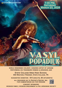 A benefit concert featuring World Renowned Violinist, honored artist of Ukraine, Vasyl Popadiuk. Vasyl will be performing his trademark Romani & Ukrainian Jazz music.