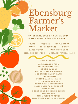 Everything from fruits, veggies, maple syrup, herbs, flowers, baked goods, jams, and more can be found at the Ebensburg Farmer's Market held every Saturday from July 6 to September 21 from 9am to noon at the Penn Eben Park. Vendors will vary from week to week depending on availability of produce.