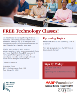 Join Mid-State Literacy Council on March 24th at 10:30 am at the Active Adult Center in the Nittany Mall (2901 E College Ave Suite #990, State College, PA 16801) for a free technology lecture called “Gardening Technology at a Glance.” In this lecture, we will review some popular apps and explain how their common features can help you with everything from designing your garden to identifying plants and caring for them. You'll also learn about smart outdoor irrigation systems and sensors, as well as indoor gardening devices. This lecture is open to any adult 50 or older. To register, please call 814-238-1809 or email agiedroc@mid-stateliteracycouncil.org.