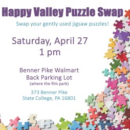 Swap your gently used jigsaw puzzles! Join us in the back parking lot of the Benner Pike Walmart (where the RVs usually park). Please bag pieces or tape the box and label puzzles with missing pieces and/or heavy smells. Pop your trunk or bring a table, wagon, or bag!