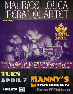 Maurice Louca's Fera in quartet live formation brings the album’s intricate, hypnotic energy to the stage with Maurice Louca on guitar and electronics, Ayman Asfour on violin, Dylan Greene on drums and percussion, and Luke Stewart on double bass, delivering the full rhythmic and dynamic range of Fera in a powerful live setting.